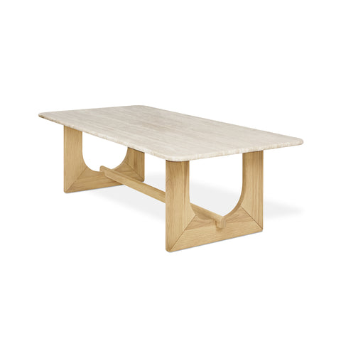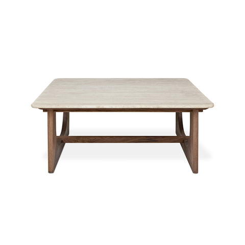 The Portico Coffee Table showcases an alluring travertine slab surface and elegantly crafted solid wood base in Walnut or White Oak. The warm, natural travertine grain creates an organic beauty that is unique to each design, reinforced by gently curved corners. These curves are mirrored in the base - with graceful forms and thoughtful proportions that blend the materials into a unified, sculptural accent. The Portico Coffee Table is available in square or rectangular size. Also available as an End Table.